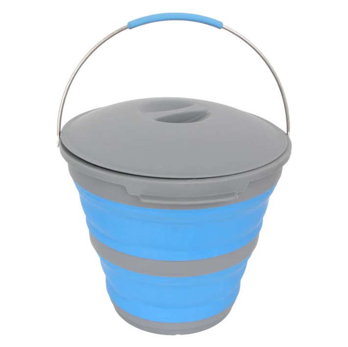 A collapsible 10L bucket with a lid, designed for strength and ease of storage. Perfect for soaking clothes or storing fishing bait while keeping odours contained.