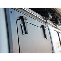 The Front Runner Gullwing window replaces the rear window of a Toyota Land Cruiser 76 allowing easy access to the cargo bay via the side of the vehicle.